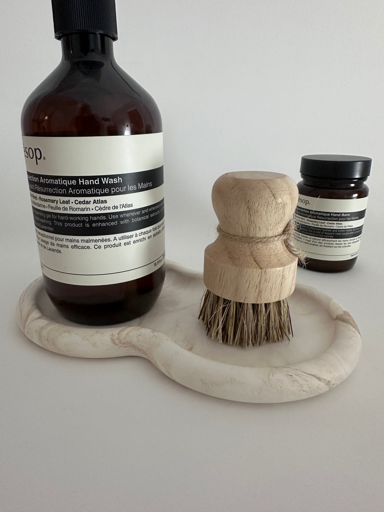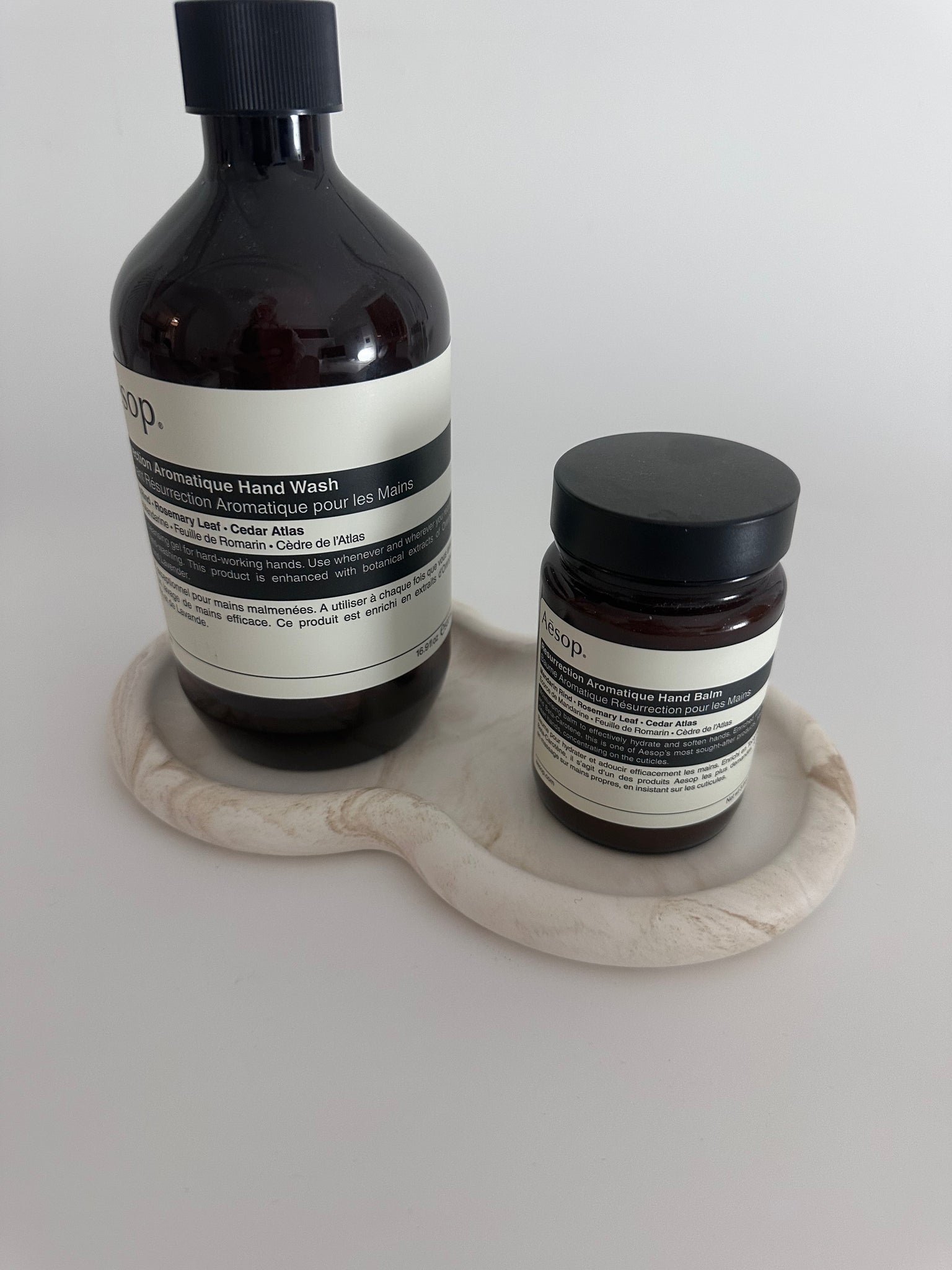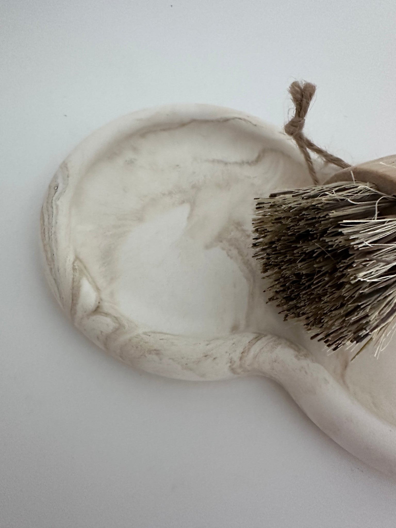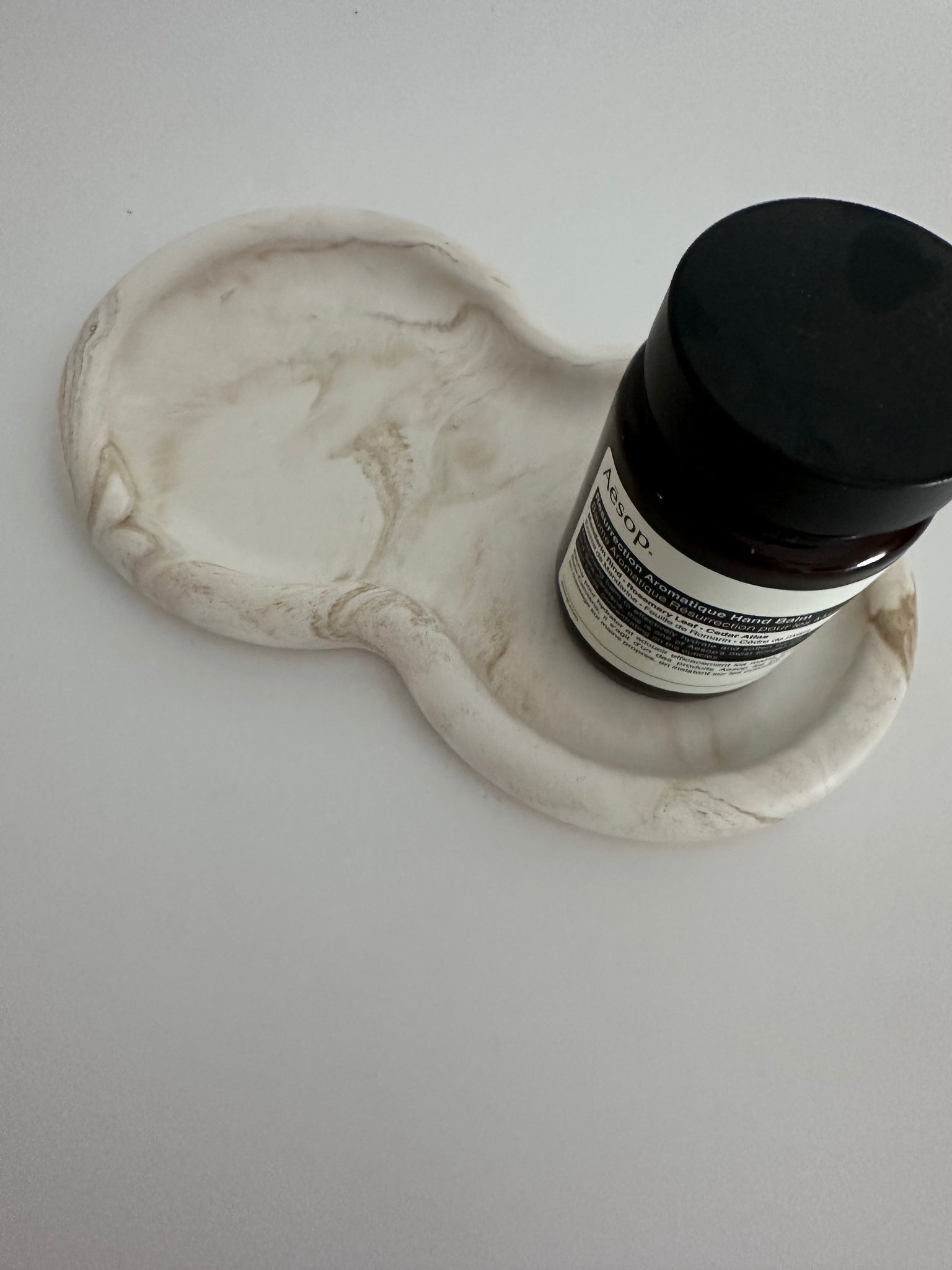 Enhance your bathroom or kitchen with this beautifully crafted curved tray, designed to hold your favorite hand wash and lotion in style. Made from soft marbled ceramic, this tray offers a smooth, matte finish that complements any décor with its natural, understated elegance. Its gently curved shape provides a secure and aesthetically pleasing display, perfect for keeping your countertop neat and organised. Durable yet refined, this versatile tray adds a touch of sophistication to your daily routine.